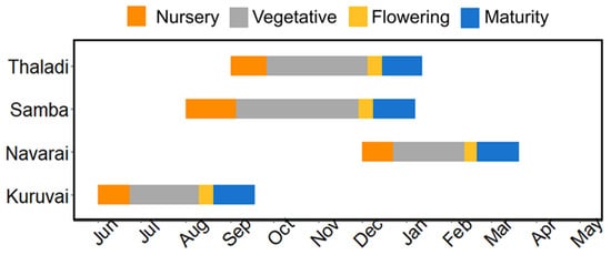 Rice is cultivated in four seasons in the Cauvery delta zone, namely Kuruvai, Samba, Thaladi, and Navarai. The cropping calendar (Figure 4) for an agricultural year starts from the Kuruvai season, which starts in June. During the Kuruvai season, short-duration varieties of rice have been cultivated. Farmers with well irrigation cultivate the Kuruvai crop since canal water reaches the delta by the last week of June or the first week of July. Samba season starts during the first week of August and ends in mid-January, which accounts for the highest share of cropped area (Table 1) among the cropping seasons. During the Samba season, long-duration varieties are cultivated owing to climatic factors of the zone, and it is observed that the canal water is available for the entire samba season. Hence, canal irrigation is predominantly followed during Samba rice cultivation. Thaladi cropping season starts in September and ends during mid-January. Farmers who raise the Kuruvai crop opt for Thaladi and cultivate either short or medium-duration rice cultivars. Since canal water is available until January, it is the major source of irrigation for cultivation during the Thaladi season. Farmers who raise short-duration cultivars during Thaladi opt for Navarai, which starts in December and ends in mid-March. The farmers who have access to supplementary irrigation opt for the Navarai season and cultivate short-duration cultivars.