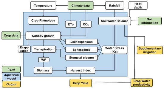 AquaCrop model illustrating the major modeling components of crop–soil–weather interactions [,].