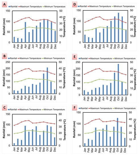 Characteristics of the climate data: climographs of new delta region pertain to (A) decade I (2021–2030); (B) decade II (2031–2040); (C) decade III (2041–2050); climographs of old delta region pertain to (D) decade I (2021–2030); (E) decade II (2031–2040); (F) decade III (2041–2050).
