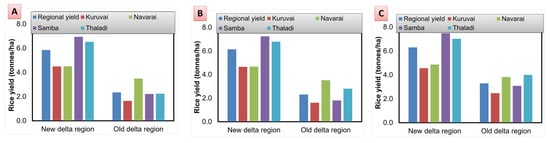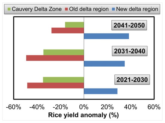 The future yield estimates from AquaCrop revealed that there is a significant difference in yield response in both delta regions. Climate change boosts rice yield in the new delta zone while lowering yield in the old delta region. The variable response between the regions against climate change is due to the soil character of the respective regions. For instance, the paddy soil of the old delta region has a higher water-holding capacity than the sandy loam soil of the new delta region, which results in more water in the field than the required amount of water during heavy rainfall, and causes the reduction in rice yield. The yield reduction in the old delta region is 48.40 percent during decade I (2021–2030), 49.30 percent during decade II (2031–2040), and 27.67 percent in decade III (2041–2050). Indeed, these findings support the cultivation of a flood-tolerant variety (CR1009 sub) specifically released for the Cauvery delta zone [].
