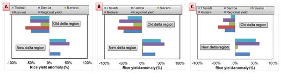 The temperatures increases by 3 °C in the new delta region against its normal temperature, while the increase is 4 °C in the case of the old delta region. Thus, during 2021–2050, the rainfall of both regions of the Cauvery delta zone decreases against the normal rainfall, ranging between 6 and 27 percent. Conversely, the temperature of both the Cauvery delta regions increases, ranging from 2 to 4 °C. Many studies documented that climate change features increasing rainfall, increasing temperature, and increasing frequency of extreme climate events. However, the climate data used in this study features decreases in rainfall in the near future. These findings are contradictory to the findings of Geethalakshmi et al. []. This deviation may be due to the adoption of a different climate model for forecasting climate data, where Geethalakshmi et al. [] employed RegCM3, whereas, following the findings of Samiappan et al. [], this study uses GFDL data. Samiappan et al. [] suggest that the application of the GFDL model could be comparatively appropriate in the case of the Cauvery delta zone. In addition, the choice of crop model used in this study could also be another possibility for contradicting results. AquaCrop relies on a few easily obtainable variables.