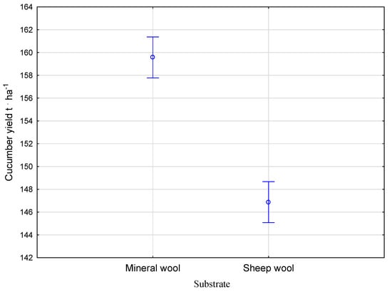 Figure 1 is a graphical presentation of the results of the univariate analysis of the variance of cucumber yields depending on the wool substrate used. It can be seen that the type of substrate used impacts the yield of cucumber in hydroponic cultivation. For the substrate made of sheep wool, the yield was 7.96% lower and significantly different from the yield obtained on rockwool substrate. Although the use of sheep wool as a substrate in the hydroponic cultivation of cucumber reduces the yield, it allows for a material that can be managed by means of biological processes after the cultivation cycle is complete.