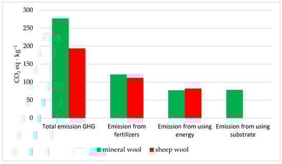 At the boundary of the adopted system, the value of the GHG emissions in the conducted vegetation experiment was 276.9 kg CO2 Mg−1 for the yield of cucumbers in the object with a mineral wool substrate and 193.8 kg CO2 Mg−1 for the yield of cucumbers with a sheep wool substrate. The significant differences in the level of the carbon footprint are related to the substrate used (Figure 2).