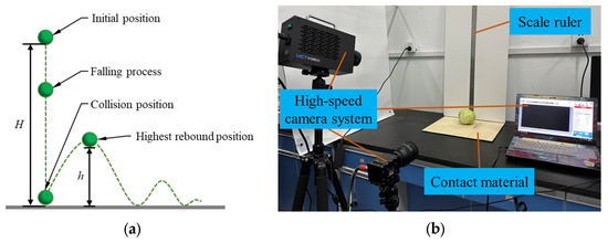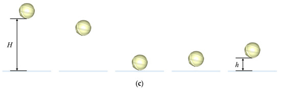 The coefficient of restitution between the cabbage and contact materials was calibrated by the free fall collision method [35,36]. As shown in Figure 3, a cabbage was selected to be released from a height of H = 500 mm to drop to the horizontal contact material. The highest rebound position was captured by a high-speed camera (Japanese NAC company, Q2m), and the height h was measured with the scale ruler. According to Newton’s law of collision, the coefficient of restitution is the ratio of the final to initial relative speed between two objects after they collide. Since the contact material does not work, the velocity before and after the contact material is 0, and the relative velocity is the cabbage velocity. Additionally, it is as follows: