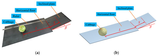 As a result of the large size of the cabbage, it is necessary to select the appropriate β and S values to guarantee the accuracy of the measurement. Therefore, referring to previously published research by Fan, G. et al. [28], after a large number of pre-experiments, β was selected as 10° and S was 260 mm. Cabbages with similar size and quality were selected for experiments. Each group of experiments was repeated 30 times and the average of the maximum rolling distance was obtained.