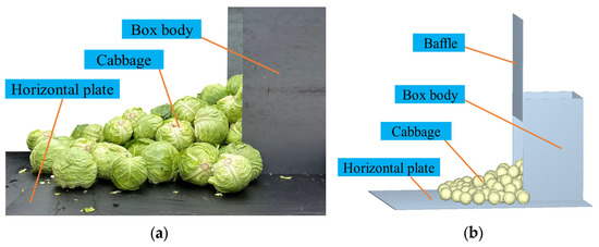 Complex movement states are reproduced during the formation of the granular material accumulation angle, which can better characterize the dispersion, flow and friction properties [30,37,38]. The accumulation angle experiment was conducted based on the drawing plate method [28,39]. As shown in Figure 7, the experimental apparatus (Q235 steel material) consisted of a rectangular box (100 height × 60 length × 60 width cm), a baffle (100 height × 60 length cm) and a horizontal plate (200 length × 200 width cm). Various contact materials (Q235 steel, PVC, EVA and wood) were used sequentially as the inner wall material of the rectangular box. After a large number of pre-experiments, 80 cabbages were selected for the experiment. To allow the cabbages to form an unconstrained particle heap on the horizontal plate, the baffle was slowly raised at a slow velocity (0.05 m/s) [12]. The experiment results indicated no significant correlation between the rectangular box material and the cabbage accumulation angle. Therefore, the rectangular box and baffle used Q235 steel material, and the horizontal plate used PVC material. After all the cabbages were stabilized, a front view photograph of the cabbage group was taken with a digital camera.