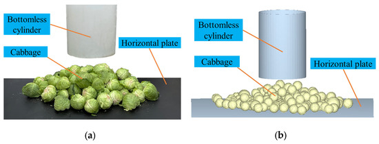 To further verify the accuracy of the above simulation results, a verification test was performed by the bottomless cylinder lifting method [12]. As shown in Figure 8, the test apparatus consisted of a bottomless cylinder (PVC material, inner diameter 60 cm and height 100 cm) and a horizontal plate (200 length × 200 width cm). After a large number of pre-experiments, 80 cabbages were selected for the experiment. The bottomless cylinder was raised at a slow velocity (0.05 m/s). After all the cabbages were stabilized, a photograph of the cabbage group was taken with the digital camera. The cabbage accumulation angle was obtained with image-processing software. The test was replicated ten times and averaged.