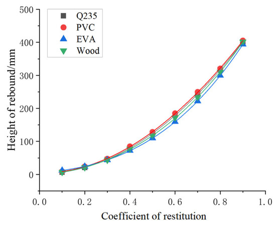According to Section 2.2.1, cabbages with similar size and quality were used for experiments. The experiments were repeated 30 times for each group, and the average value of the maximum rebound height was calculated. If the cabbage was damaged during the experiment, the result was considered as invalid and repeated with new cabbage. Furthermore, the coefficient of restitution between the cabbage and materials was obtained by Equation (1). The results are shown in Table 4.