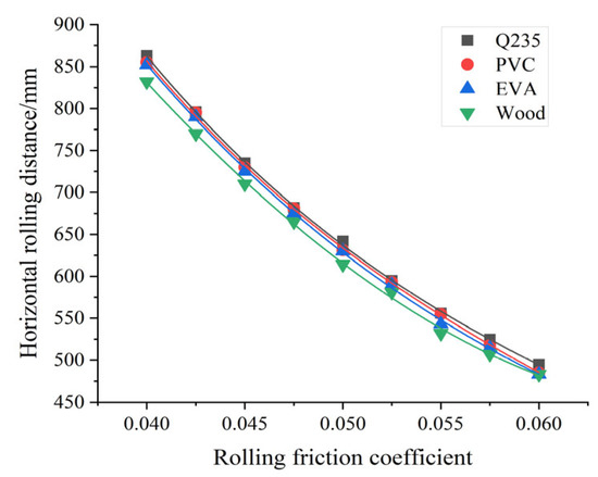 According to Section 2.2.3, the rolling friction coefficient between the cabbage and the materials was obtained from Equation (3), and the actual measured values are displayed in Table 6.