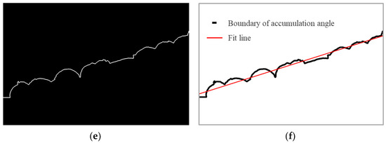 The cabbage accumulation angle experiments were conducted referring to Section 2.3.2 (1), and the collected images were processed with MATLAB software [30]. The original image (Figure 12a) was subjected to grayscale processing (Figure 12b), binarization processing (Figure 12c), hole filling (Figure 12d), boundary contour extraction (Figure 12e) and linear fitting (Figure 12f). The experiment was replicated ten times and averaged. The resulting measured value of the cabbage accumulation angle was 17.52°.