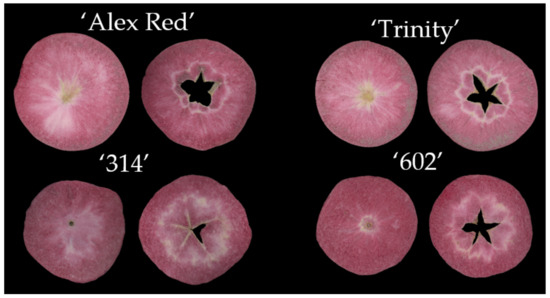 The exemplary color images of freeze-dried slices of ‘Alex Red’, ‘Trinity’, ‘314’, and ‘602’ red-fleshed apple genotypes.