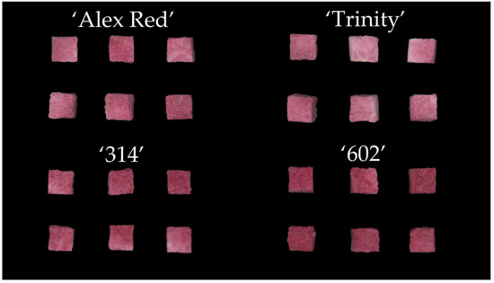 The sample color images of freeze-dried cubes of ‘Alex Red’, ‘Trinity’, ‘314’, and ‘602’ red-fleshed apple genotypes.