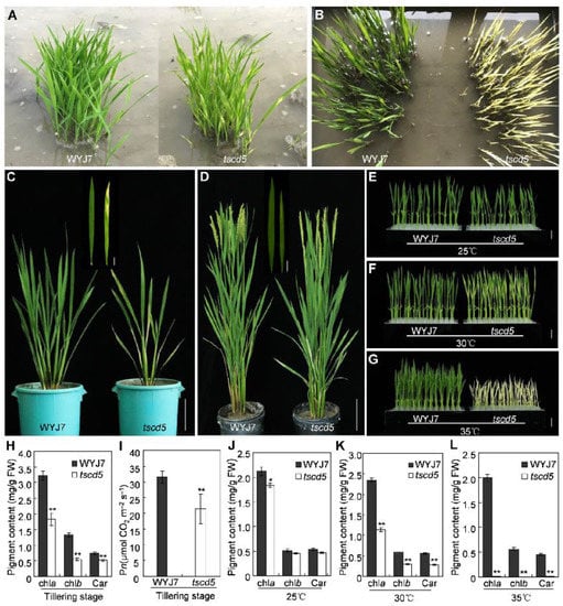 Phenotypic characterization of the WYJ7 and tscd5 mutants in rice. (A) Phenotypes of WYJ7 and tscd5 grown in the June at seedling stage in the paddy field. (B) Phenotypes of WYJ7 and tscd5 grown in the July at seedling stage in the paddy field. (C) Phenotype of WYJ7 (left) and tscd5 mutant (right) at the tillering stage grown in the paddy field. (D) Phenotype of WYJ7 (left) and tscd5 mutant (right) at the heading stage grown in the paddy field (Scale bar = 10 cm). (E–G) Phenotype of WYJ7 (left) and tscd5 mutant (right) grown at 25 °C (E), 30 °C (F), 35 °C (G), respectively (Scale bar = 2 cm). (H) Pigment contents of the tillering stage of WYJ7 and tscd5 mutants grown in the paddy field. (I) Net photosynthetic rate (Pn) of the tillering stage of WYJ7 and tscd5 mutants grown in the paddy field. (J–L) Pigment content of the three-leaf stage of WYJ7 and tscd5 mutants grown at 25 °C (J), 30 °C (K), 35 °C (L), respectively. Mean ± SD, n = 3, * significance at p < 0.05, ** extremely significance at p < 0.01 (Student’s t-test).