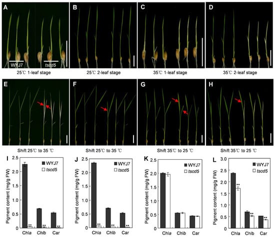 Phenotypes and pigment contents comparison between WYJ7 and tscd5 plants at shift 25 °C to 35 °C and shift 35 °C to 25 °C in rice. (A–D) Phenotypes of the WYJ7 and tscd5 at the one-leaf and two-leaf stage grown at continuous 25 °C and 35 °C, respectively. (E–H) Phenotypes of the WYJ7 and tscd5 at the three-leaf stage grown at continuous 25 °C shift 25 °C to 35 °C, continuous 35 °C, shift 35 °C to 25 °C, respectively. (I–L) Pigment contents of the new third-leaf of WYJ7 and tscd5 plants grown at first-leaf shift 25 °C to 35 °C (I), second-leaf shift 25 °C to 35 °C (J), first-leaf shift 35 °C to 25 °C (K), second-leaf shift 35 °C to 25 °C (L). (Scale bar = 2 cm). Mean ± SD, n = 3. ** extremely significance at p < 0.01 (Student’s t-test).