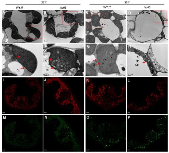 The ultra-structure of chloroplast in the mesophyll cells of WYJ7 and tscd5 plants at the three-leaf stage were visualized by transmission electron microscopy (TEM) (Figure 3A–H). At 25 °C, the chloroplast of WYJ7 and tscd5 plants exhibited well-developed lamellar structures furnished with normally stacked grana and thylakoid membranes (Figure 3A,B,E,F). However, the albino leaf cells in tscd5 contained fewer chloroplasts and grana lamellae compared with those in WYJ7 at 35 °C (Figure 3C,D,G,H). TEM observation also found that thylakoids and stroma lamellae structure in leaves were disorderly arranged and more osmiophilic granules (OG) in the tscd5 mutant compared to WYJ7 during the tillering stage at high temperature (Supplementary Figure S1). Therefore, chloroplast development was hampered in the tscd5 mutant at high temperature.