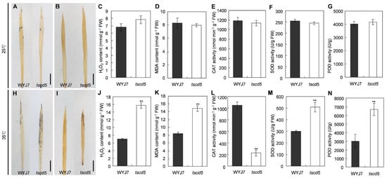 High temperature stress usually induces the accumulation of ROS in plant cells [53]. The noxious ROS can further lead to lipid peroxidation, cellular damage and even cell death. We used NBT and DAB staining to detect H2O2 and O2−, respectively. The fresh leaves of the WYJ7 and tscd5 plants cultured at 25 °C and 35 °C at the three-leaf stage were incubated in NBT and DAB. NBT and DAB staining showed that the copious H2O2 and O2− accumulation were visualized in leaves of tscd5 cultured at 35 °C (Figure 4A,B,H,I).