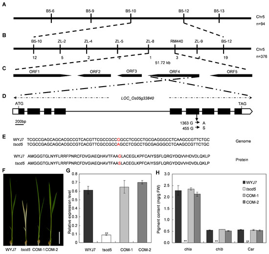 For fine-mapping of the TSCD5 gene, the tscd5 mutant was crossed 93-11 (indica variety) to acquire a F2 segregating population. We first mapped the TSCD5 locus between two markers, B5-10 and B5-12 on chromosome 5 using 94 F2 individuals with the tscd5 phenotype (Figure 5A). To fine map TSCD5, one SSR and five InDel markers were developed between B5-10 and B5-12. The TSCD5 locus was finally narrowed to 51.72 kb between ZL-8 and RM440 markers with 376 F2 mutant individuals (Figure 5B). Five open reading frames (ORFs) predicted in this region according to Nipponbare genome (https://rapdb.dna.affrc.go.jp/ accessed on 15 October 2021) (Figure 5C) were then sequenced and only a single nucleotide mutation (G→A) in LOC_Os05g33840 was detected at 1363 bp from the ATG start codon, which caused an amino acid substitution of Gly455 with Ser455 (Figure 5D,E).