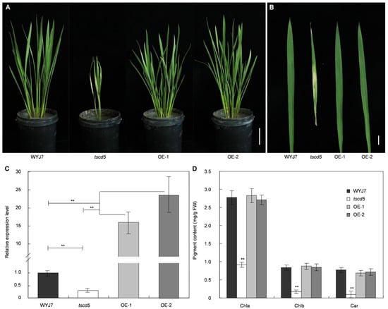 Overexpression analysis of TSCD5 gene in tscd5 mutant of rice. (A) Phenotype of WT, tscd5, OE-1 and OE-2 plants at tillering stage (Scale bar = 10 cm). (B) Close-up image of leaves of WYJ7, tscd5, OE-1 and OE-2 plants at tillering stage (Scale bar = 2 cm). (C) The expression levels of TSCD5 in WYJ7, tscd5, OE-1 and OE-2 at tillering stage, Histone was used as a control for qRT-PCR. (D) Pigment content of WYJ7, tscd5, OE-1 and OE-2 plants at tillering stage. Mean ± SD, n = 3, ** extremely significance at p < 0.01 (Student’s t-test).
