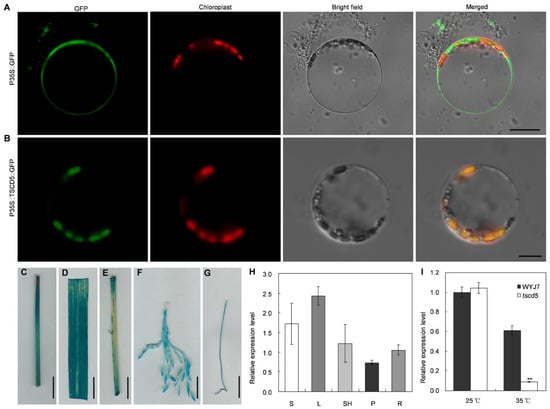 Subcellular localization of the TSCD5-GFP protein in rice protoplasts and tissue expression pattern of TSCD5. (A) Rice protoplast transformed with p35S::GFP as a control. Scale bar = 5 μm; (B) Rice protoplast transformed with p35S::TSCD5::GFP. Scale bar = 5 μm. (C–G) GUS staining of transgenic rice with pTSCD5::GUS at the heading stage. (C) Stem. (D) Leaf. (E) Sheath. (F) Panicle. (G) Root. Scale bar = 2 cm. (H) Relative expression levels of TSCD5 in various tissues revealed by qRT-PCR. (I) Relative expression levels of TSCD5 in WYJ7 and tscd5 at the three-leaf stage grown at 25 °C and 35 °C. Histone was used as a control for qRT-PCR. Mean ± SD, n = 3, ** extremely significance at p < 0.01 (Student’s t-test).