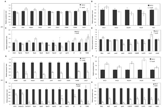 We investigated the expression levels of genes associated with chlorophyll synthesis and degradation, chloroplast development and photosynthesis in the tscd5 mutant and the wild-type. At 25 °C, the expression levels of many tested genes in tscd5 were mostly similar to those in WYJ7 (Figure 8A–D). While at 35 °C, the expression levels of these tested genes related to chlorophyll biosynthesis, such as glutamyl tRNA reductase (HEMA), GSA aminotransferase (GSA), Heme Oxygenase 1 (Heme1), magnesium-chelatase subunit chlD (CHLD), divinyl reductase (DVR), Mg-chelatase H subunit (CHLH), protochlorophyllide oxidoreductase A/B (PORA, PORB) and chlorophyll a oxygenase (CAO1) were significantly decreased in tscd5 compared with WYJ7 plants (Figure 8E); the expression levels of all tested genes for chlorophyll degradation, such as NON-YELLOW COLORING 1 (NYC1), NON-YELLOW COLORING 3 (NYC3), Red Chlorophyll Catabolite Reductase 1 (RCCR1), PCCR, Chlorophyllide a Oxygenase (PAO) were significantly increased in tscd5 mutant compared with WYJ7 plants (Figure 8F), which were consistent with the decrease in Chl contents and the albino phenotype in tscd5 (Figure 1E,G). Compared with WYJ7, expression levels of genes associated with chloroplast development, encompassing Heat-stress Sensitive Albino 1 (HSA1), Plastid RNA Polymerase (OsRpoTp), plastidal DNA polymerase (OsPOLP1), RNA polymerase α, β and β’ subunits (RpoA, RpoB, RpoC1, RpoC2), ribosomal proteins (rps7, rps15), Virescent1 (V1), Virescent2 (V2), Thermo-sensitive Chlorophyll-deficient mutant 5 (TCM5), and photosynthesis related genes, such as Rubisco Large Subunit (RbcL), small subunit of Rubisco (RbcS), Photosystem I Subunit A (psaA), Photosystem II Subunit of A (psbA), Chlorophyll a/b Binding Protein (CAB1R, CAB2R), LchP2, Lhcb1, Lhcb4, were decreased significantly in tscd5 (Figure 8G,H).