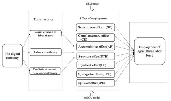 Our study attempts to fill these gaps. First, we developed a theoretical framework to analyze a series of effects (“employment effects”) induced by the digital economy on the employment of agricultural laborers. Second, we collected microdata on 1098 agricultural laborers in Shandong Province through a field study in order to reveal the relationships among the employment effects of agricultural laborers. Third, to address the complex causal relationship formed by the interdependence of multiple antecedent conditions, we adopted a combination of quantitative and qualitative approaches. This allows us to explore the combination of spillover effects of the digital economy on agricultural labor force employment using structural equation modeling (SEM) and fuzzy set qualitative comparative analysis (fsQCA) approaches.