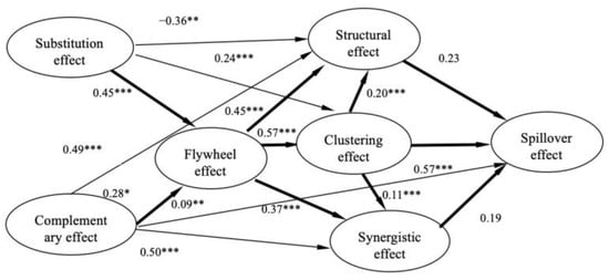 Figure 3 shows the results of the structural equation model with standardized path coefficients. This model was built in the AMOS 26.0 software using the maximum likelihood estimation method and was based on the theoretical analysis framework described above. The ellipses indicate the latent variables: substitution effect (SE), complementary effect (CE), accumulative effect (AE), structure effect (STE), synergistic effect (SYE), and flywheel effect (FE).