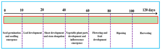 The present experimental work was conducted during the rabi (winter) season under natural environmental conditions (27°88′ N latitude, 78°08′ E longitude, and 184 m altitude above sea level; the annual average temperature is between 28 and 33 °C, the average temperature of winter varies from 12 to 16 °C and the relative humidity ranges from 56 to 77%) in the Botany Department, Aligarh Muslim University, Aligarh, India. Earthen pots (25 × 25 cm) were packed with sandy loamy soil and organic manure at a 4:1 ratio. A basal recommended dose of nutrients, such as nitrogen (N) in the form of urea, phosphorus (P) in the form of superphosphate, and potassium (K) in the form of muriate of potash, at 80 kg N, 40 kg P2O5 and 40 kg K2O/ha, i.e., 36 mg N, 17.9 mg P2O5 and 17.9 mg K2O/kg, were applied at the time of sowing [1]. Later, seeds were uniformly sown in the pots at a depth of 4–5 cm. On the basis of previous finding from Shah et al. [1], the two time-points i.e., fifty and seventy days after sowing were selected as the appropriate times for foliar feeding. The plants were sprayed twice with water, 10−6 M IAA, 10−6 M EBL, 10−5 M GA3, 10−3 M put, 10−5 M SA and 10−6 M Tria on 20-days interval. The selected PGRs and their concentrations were decided based on studies [17,18,19,20,21,22]. Sampling was performed at ninety days after sowing, in order to study morphological and physicochemical parameters, and conduct microscopic analysis. The yield features were studied at 120 DAS (harvest). The mustard plant growth stages are mentioned in Figure 1.