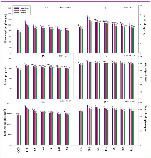 Of the PGRs tested, EBL proved to be the most effective, and significantly improved all growth attributes of mustard. The effects of EBL were followed by SA. The foliar application of EBL increased SL by 31.2, 35.3, and 28.4%, branches per plant by 30, 36.3, and 33.3%, leaves per plant by 11.4, 10.8, and 9.2%, area per leaf by 8.4, 8.7 and 7.4%, leaf area per plant by 20.7, 27.8, and 22.9%, FW by 9.9, 12.6, and 10.4%, and DW by 34.7, 35.4, and 37.6%, in the Chutki, Nath Sona and Rohini cultivars, respectively, relative to water-spray treatment (Figure 2A–F and Figure 3A).