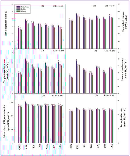 Effect of foliar spray of PGRs on (A) Dry weight per plant, (B) Chlorophyll content, (C) Net photosynthetic rate, (D) Stomatal conductance, (E) Inter-cellular CO2 concentration and (F) Transpiration rate of the mustard cultivars Nath Sona, Rohini and Chutki. Data are treatment means with the standard error (±SE) of four replicates. The different small and capital letters represent a significant difference in three cultivars among various treatments confirmed through Duncan’s Multiple Range test at p ≤ 0.05.