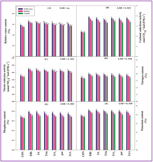 Spray treatment with PGRs, especially EBL, followed by SA and Tria, significantly enhanced leaf mineral nutrient content. The leaf-applied EBL increased N content by 10.9, 15.4, and 13.3%, P content by 7.9, 15.2, and 10.7%, and K content by 11.8, 15.7, and 13.4% in the Chutki, Nath Sona, and Rohini cultivars, respectively, relative to the water-sprayed plants (Figure 4D–F).