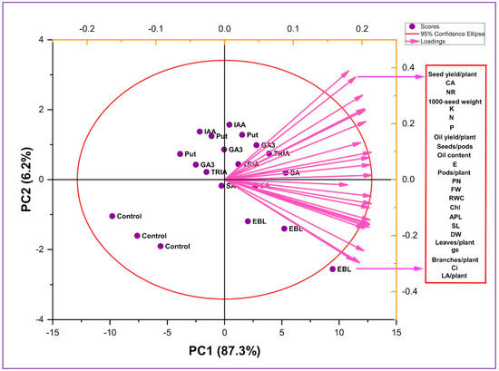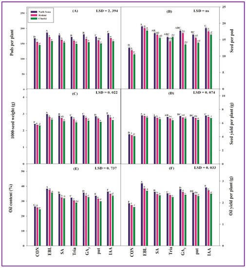 Treatment with PGRs increased pods/plant, seeds/pod, 1000-seed weight, seed yield/plant, oil content, and oil yield/plant (Figure 5A–F), relative to the control. This may be due to PGR-mediated improvements in growth characteristics and physio-biochemical processes that result in higher productivity. Moreover, the enhancements in plant biomass accumulation, enzymatic activities, photosynthesis, and mineral nutrient content would positively impact yield traits and oil production. PGRs aid the synthesis of amino acids, chlorophyll, vitamins, protein, and oils, and also affect carbohydrate metabolism. PGR application augments oil synthesis and acetyl CoA content. Foliar treatment with PGRs, showed increases in seed yield, weight, oil percentage, and biological yield in oilseed crops had been investigated. The changes in yield features might be due to the higher values for morphological and photosynthetic traits, and the nutrient content of the plants. Our results are supported by those of Vekaria et al. [51] on the effects of IAA and GA3 on sesame, Zafari et al. [52] on 24-EBL and safflower, Hasan and Ismail [53] on GA3 and sunflower, Meena et al. [54] on SA and mustard, Mabudi Bilasvar et al. [55] on the effects of SA and put on mustard, Alamri et al. [56] on IAA and brinjal, and Ahmad et al. [57] on GA3 and pea plants. Among the various PGRs, the stronger effects of 24-EBL could be due to its influences on gas exchange parameters, photochemical efficiency, activation of proton pumps, stimulation of protein and nucleic acid synthesis, and modulation of cell division and expansion, effects which would lead to better growth and productivity of plants.