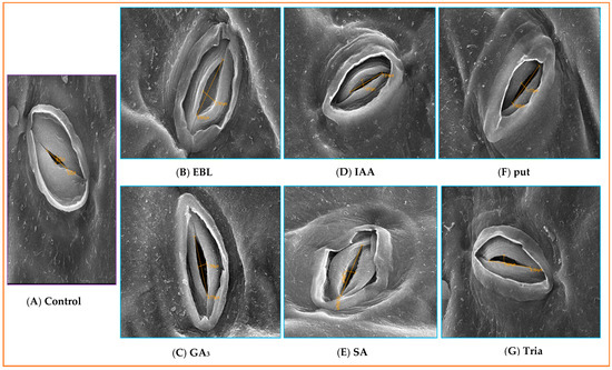 SEM showed that the leaves of plants treated with PGRs had higher stomatal aperture widths relative to the control plants, with EBL treatment having the greatest impact, followed by GA3, IAA, and SA. The stomatal aperture width was greater in plants treated with EBL than in the water-treated plants (Figure 6A–G).