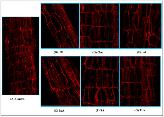 Confocal microscopic images, assessing the viability of root cells of the Nath Sona mustard cultivar at 90 DAS. Results for the (A) Control and (B–G) plants treated with EBL, IAA, GA3, SA, put and Tria.