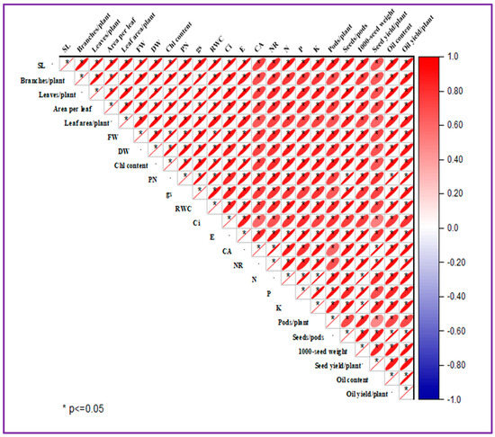 Figure 8 shows a PCA biplot encompassing two components (PC1 and PC2) that cover 87.3% and 6.2% of the total variation in the studied parameters among the three cultivars. Positive correlations were observed between several traits, such as seed yield/plant, CA and NR activity, 1000-seed weight, NPK content, oil yield and content, Chl content, and gas exchange parameters. The correlation matrix (Figure 9) showed significant positive correlations between different parameters studied (p ≤ 0.05).
