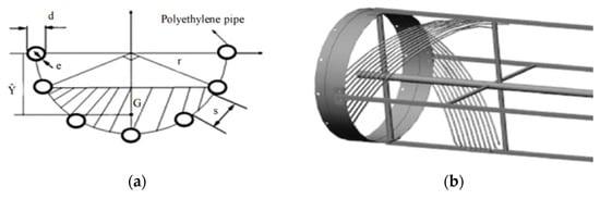 Gradation pipes cross-section at a semicircle of the helix ((a) scheme; and (b) general form): d—the bar diameter; е—bar thickness; s—bar spacing; r—drum radius; G—center of gravity of the drum; and —distance from the center of gravity to the center of the bar.