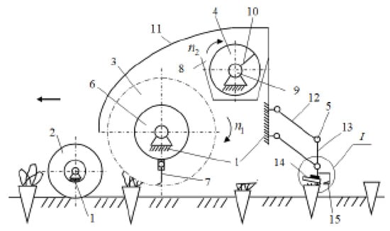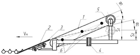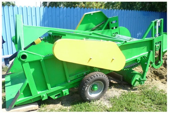 The quality of work is determined by the optimal solution to the problem of providing the required parameters of the machines, both for sowing, harvesting, and the post-harvest processing of crops [,,], while maintaining the full potential of seeds and grown products [,,]. The determining indicator of the quality of crop harvesting is their preservation and the minimum amount of losses and damage to marketable products, with an effective value of cleaning from various impurities, which cannot be achieved without the introduction of modern harvesting machines. The main difference between the harvesting of root crops and onions from the harvesting of other agricultural crops is the increased volume of separated soil and plant impurities, therefore, the separating system of machines for harvesting vegetables and potatoes should have a high-throughput [,]. However, the separating system of harvesters, represented by bar elevators, does not allow the full cleaning of commercial products from mechanical impurities, and to eliminate this drawback, separation intensifiers of various types have been introduced into their design. R. Farhadi et. at [] intensified the process of the separation of potato tubers, the scheme and the general view of which are shown in Figure 1 and Figure 2.