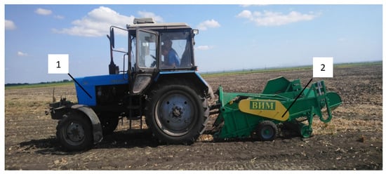 General view of the harvesting unit for harvesting root crops and onions, equipped with a separating rod elevator with an adjustable blade inclination angle: 1—MTZ 1221 tractor; and 2—machine for harvesting root crops and onions.