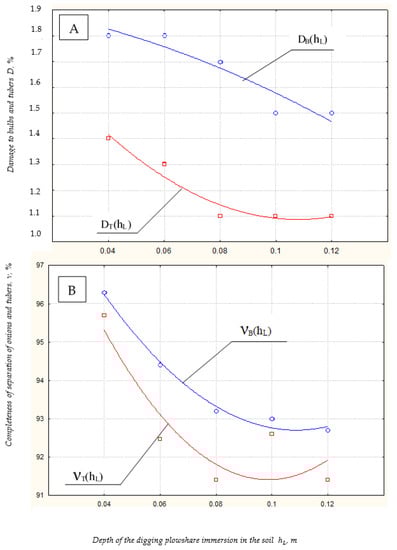 An obvious circumstance is an increase in the completeness of the cleaning of the root crops (Figure 7B), with a decrease in the depth of digging, which is due to a decrease in the supply of soil impurities to the cleaning devices and a simultaneous increase in damage to the marketable products.