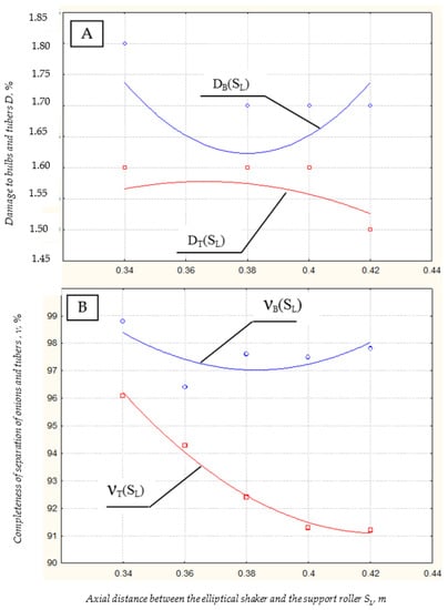 Dependence of: (A) damage to bulbs DB and tubers DT, %; and (B) completeness of separation of onions and tubers % of the separating rod elevator with an adjustable blade inclination angle from the center distance SL between the shakers.