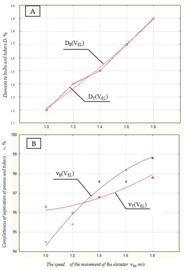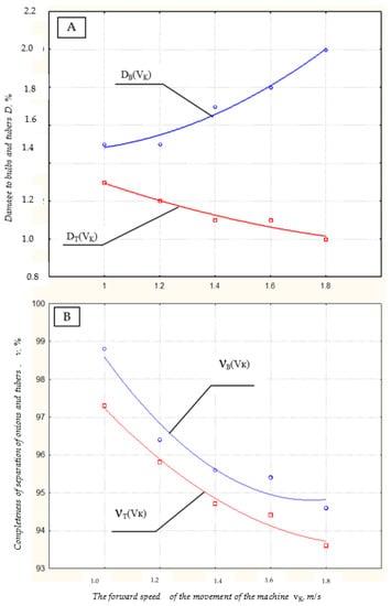 Dependence: (A) damage to bulbs DB and tubers DT%; and (B) completeness of separation of onions and tubers % of the separating rod elevator with an adjustable blade inclination angle from the translational speed of the rod elevator.