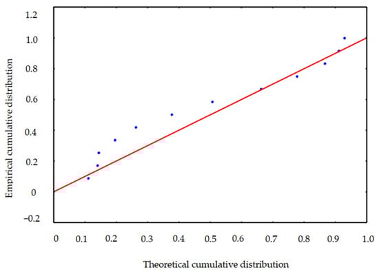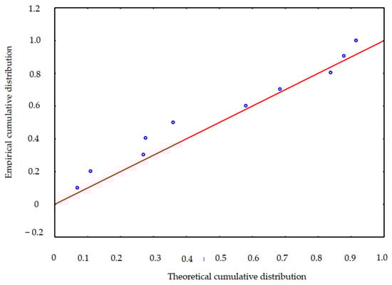 Plot of observed values (empirical cumulative distribution) versus expected frequencies (theoretical cumulative distribution).