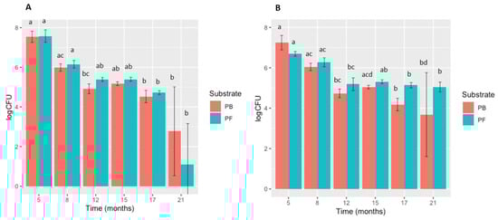 CFUs of P. cryptogea decreased significantly between 5 and 8 months, then continued to decrease gradually (Figure 1). For PF, the final sample at 21 months showed a drastic and significant decrease in CFUs. In contrast, P. cactorum CFU recovery decreased significantly at each time point up to 12 months with a more gradual decrease from 12 to 21 months in the PF substrate, whereas in the PB substrate a significant decrease was observed at 21 months.