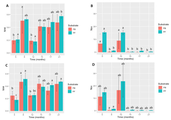 The substrate levels of NH4 showed a progressive increase over time (Figure 2). For P. cryptogea, the NH4 concentrations ranged from 0.29 ± 0.07 to 0.76 ± 0.29 in PB and from 0.27 ± 0.07 to 0.79 ± 0.04 (mg/L) in PF over 5 to 21 months. For P. cactorum, the NH4 concentrations ranged from 0.37 ± 0.10 to 0.71 ± 0.15 in PB and from 0.27 ± 0.05 to 0.77 ± 0.15 (mg/L) in PF. Thus, the NH4 concentrations in both substrates for P. cryptogea and P. cactorum tended to increase over time. The differences in the NH4 concentrations for both pathogens and substrates were pathogen species-specific with time in the different substrate types (PB: P. cryptogea p = 8.613 × 10−5; P. cactorum p = 0.0147; PF: P. cryptogea p = 5.419 × 10−5; P. cactorum p = 4.67 × 10−5).
