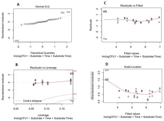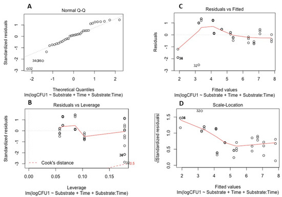 Model validation for survival of Phytophthora cryptogea: (A) Q-Q plot of standardized residuals against fitted values of the model; (B) residuals versus leverage values; (C) residuals versus fitted values plot; (D) scale location of residual values plot.