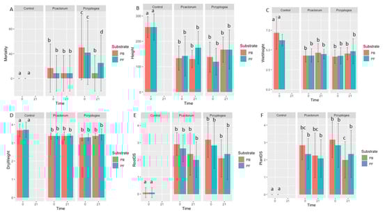 Pathogenicity indices of inoculated Eucalyptus globulus in Phytophthora cryptogea 21, P. cryptogea 0, P. cactorum 21, and P. cactorum 0 treatments. (A) Mortality (% of dead plants); (B) plant height (mm); (C) plant wet weight (g); (D) plant dry weight (g); (E) root disease severity index (RDS); (F) plant disease severity. Different letters above the bars indicate significant differences (p < 0.05).