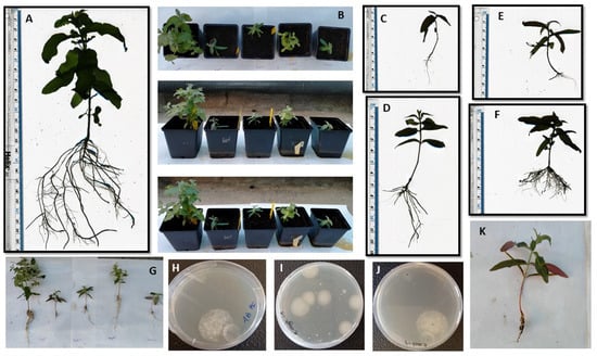 Pathogenicity assay with Eucalyptus globulus and colony forming unit counts: (A) root scanner image of an Eucalyptus globulus control plant; (B) in planta inoculated E. globulus plants shown at different angles with, from left to right: control; Phytophthora cryptogea 0; P. cactorum 0; P. cryptogea 21; and P. cactorum 21; (C–F) root scanner images of E. globulus inoculated with P. cryptogea 0 (C); P. cryptogea 21 (D); P. cactorum 0 (E); and P. cactorum 21 (F). (G) Plant and root system of inoculated E. globulus plants, from left to right: control, P. cryptogea 0, P. cactorum 0, P. cryptogea 21, and P. cactorum 21. (H) CFU (dilution 10−4) peat-free substrate inoculated with P. cactorum; (I) CFU peat-based substrate inoculated with P. cryptogea (total in sample × CFU/g dry wt); (J) CFU (peat-based substrate inoculated with P. cactorum (total in sample × CFU/g dry wt; (K). E. globulus plant inoculated with P. cryptogea 0.