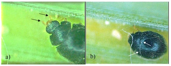 The specialist mite predator Stethorus gilvifrons coping with the web of the date palm mite, Oligonychus afrasiaticus: (a) using palp and mandibles to cut silk threads; (b) forced entry through forward thrust movement as depicted by web threads over the body. Black arrows represent the use of mandibles, while white arrows represent the web roof being dragged and ruptured by the forced movement.