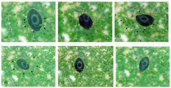 For the experimentation, small leaf arenas were made out of suitable host plants for each pest mite species: date palm frond for DPM, eggplant leaf for TSSM, citrus leaf for CBM and Conocarpus leaf for ABM. A circular leaf disk (5 cm diameter) was cut in the case of eggplant, citrus and Conocarpus plants, while a rectangular frond section (3 × 5 cm2) was cut in the case of date palm frond. The respective leaf sections were placed over an inverted plastic Petri dish (5 cm diameter) and surrounded with wet cotton to provide moisture to the leaf and restrict mites from leaving the arena. Three treatments for each pest species were set, based on the density of mites released, as 5 (T1), 10 (T2) and 15 (T3) adult gravid females were released into their respective arenas. Each treatment was replicated eight times. The treatments and the replicates were placed in the laboratory at controlled environmental conditions of 27 ± 3 °C temperature with 50% RH for five days to let the pest mite species construct webbing structures. Each of the pest mite species was allowed to lay eggs, while any immature individuals emerging from eggs were carefully removed without disturbing the web integrity. This was done to keep the number and age of individuals as similar as possible in each treatment and replicate. Furthermore, the eggs were not removed as the place/site of oviposition is among the key characteristics defining the life type of spider mites [8,10,11,34]. After five days, a 12 h starved female S. gilvifrons was released in each arena. The arenas were then covered with a plastic Petri dish lid to prevent the predator from flying away.