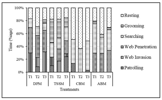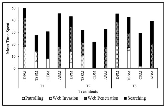 Web penetration (feeding inside the web after forced entry) was exhibited more against the web structures of DPM and ABM (Figure 5). The mean time spent for this behavior was highest against DPM and ABM in all treatments (Table 2). Searching (walking outside the web) was highest against CBM and ABM both in the percentage (Figure 5) and mean time spent by the predator (Table 2).