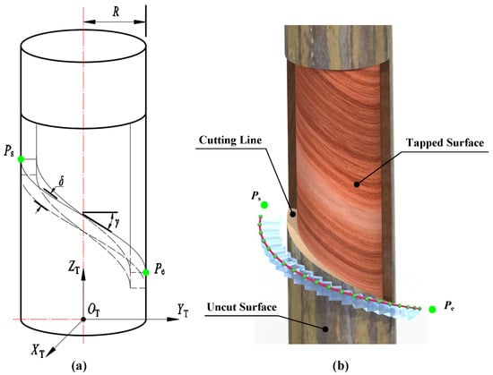 The cutting trajectory is a crucial factor for achieving efficient rubber-tapping with a robotic arm. To optimize the trajectory for the six-joint series robotic arm, a mathematical model of the trunk was constructed, as shown in Figure 2a. In this model, the trunk coordinate system is defined as , and the starting and end points of the trajectory are denoted as and , respectively. The thickness of the bark for each cut is denoted as . To achieve a standardized cutting trajectory that is compatible with the robotic arm, the slope of the cutting line, denoted as , was set to 30°, and the radius of the trunk was denoted as R. By utilizing the geometric relationships, the endpoint position can be calculated from the starting point using Equation (1):